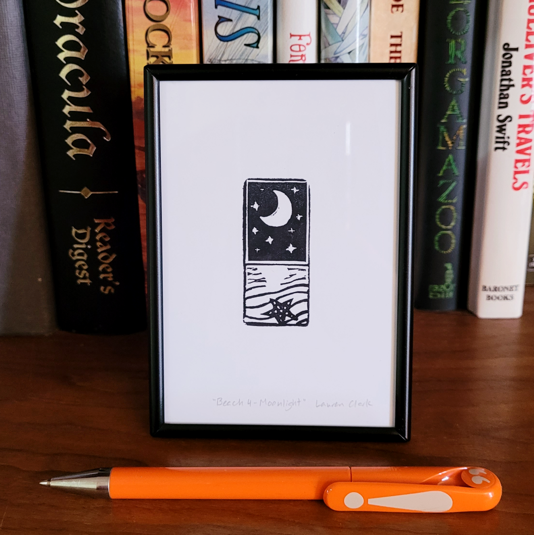 This is a print of my hand-carved “Beach 4 – Moonlight” pink eraser stamp. It is printed in black on white cardstock and signed in pencil.